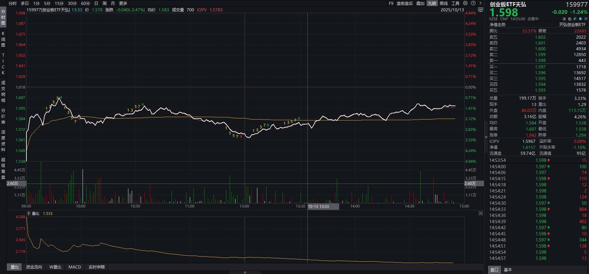 10月13日,创业板在早盘低开后震荡回升,稀土永磁、锂电产业链活跃不断。相关ETF中,临近尾盘收盘,创业板ETF天弘(159977)跌幅收窄至1.24%,较日内最低点反弹回升超3%,振幅超4%。