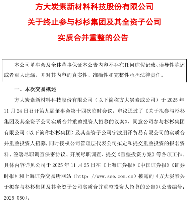 此公告一出,意味着方大炭素给持续了仅40天的参与行动正式画上句号。回看方大炭素的参与过程,2025年11月24日,公司召开第九届董事会第十四次临时会议,审议通过了《关于拟参与杉杉集团及其全资子公司实质合并重整投资人招募的议案》,同意参与上述两家企业的实质合并重整投资人招募,并授权公司管理层开展后续一系列工作。