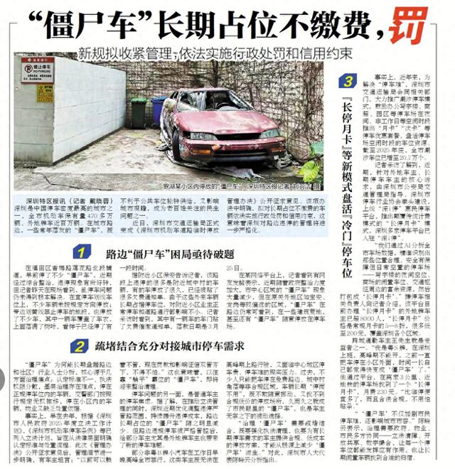 “治理‘僵尸车’需要疏堵结合,既要强化执法清理,也要为有长期停车需求的车主提供合规、低成本的停放方案,才能从根源上减少‘僵尸车’滋生。”对此,深圳市人大代表陈晓云分析指出。